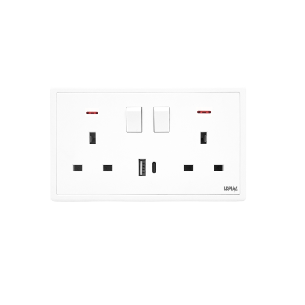 SWITCH SOCKET 2G 13A + NEON WITH USB TYPE A & C FAST CHARGER (Arora Series)